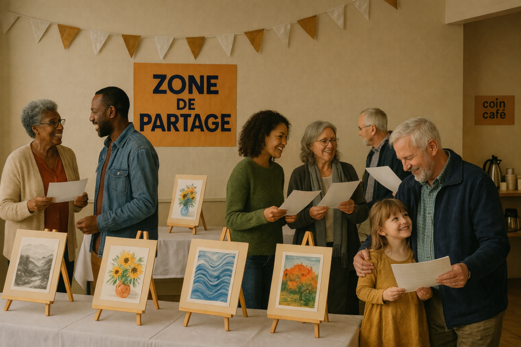 Les Zones de Partage paraissent très simples quand on les découvre : quelques œuvres plastifiées, un meuble, des petites étiquettes « SERVEZ-VOUS », une consigne bienveillante… En réalité, derrière cette impression de simplicité se cache un vrai travail de conception et d’organisation.