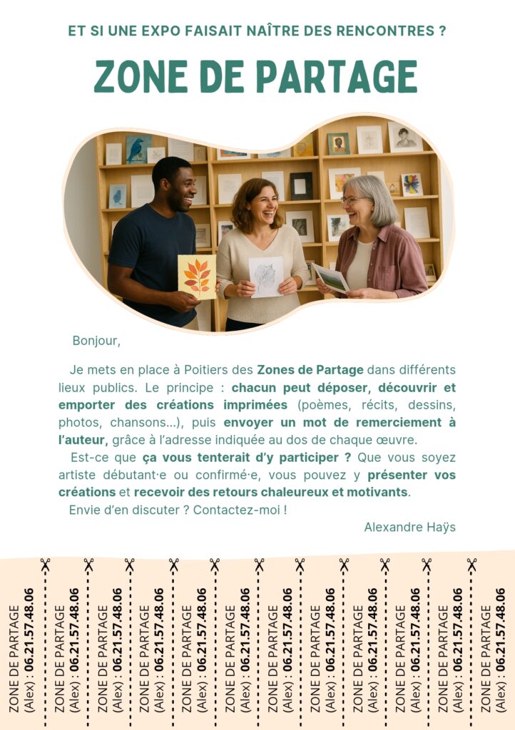 Sur cette page, je rassemble au fur et à mesure les affiches et visuels utiles pour installer une Zone de Partage, la rendre compréhensible, et faciliter la mobilisation autour du projet.