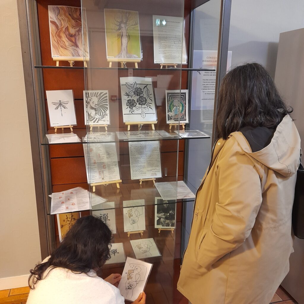 - Les artistes, bien évidemment, qui ont accepté d’exposer (photo ci-dessus : Deux visiteuses découvrent la vitrine d’ “À Portée d’Art”).